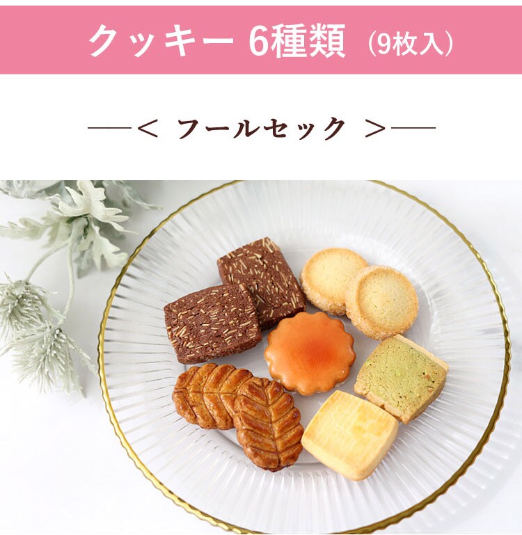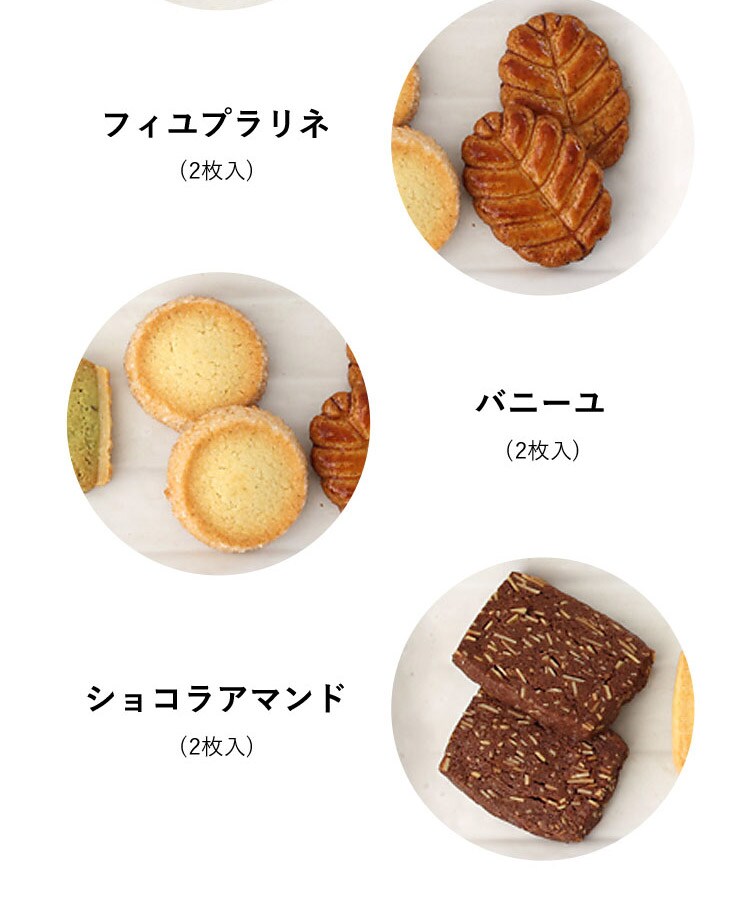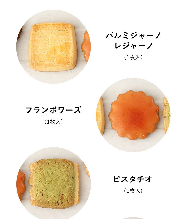 内容量:フールセック9枚入(パルミジャーノレジャーノ1枚、フランボワーズ1枚、ピスタチオ1枚、フィユプラリネ2枚、バニーユ2枚、ショコラアマンド2枚)