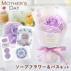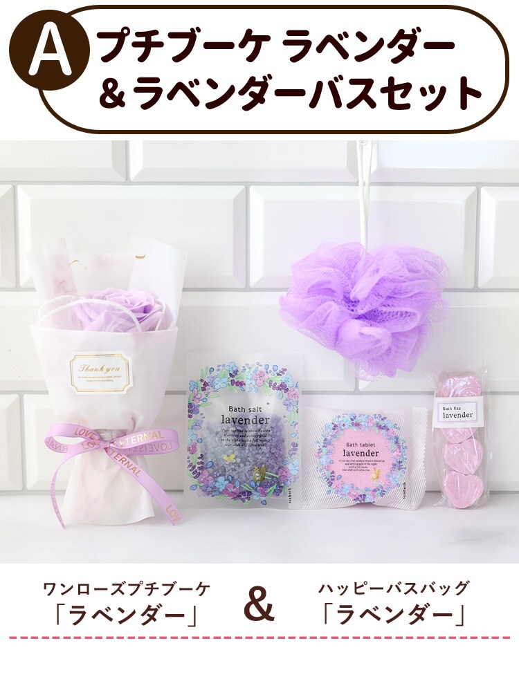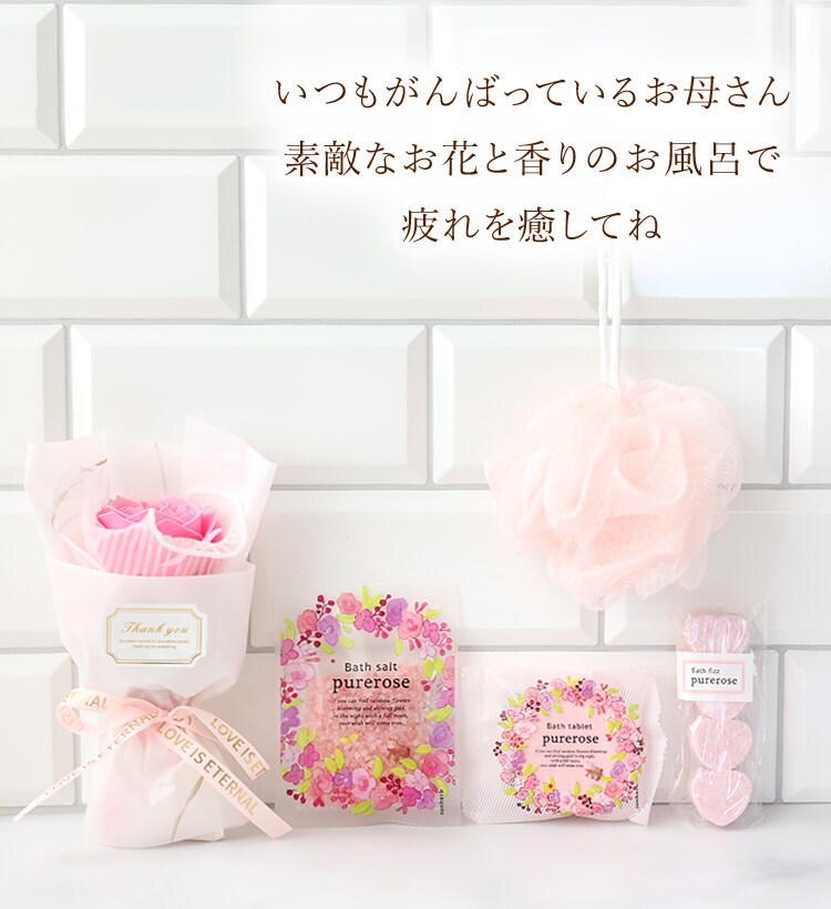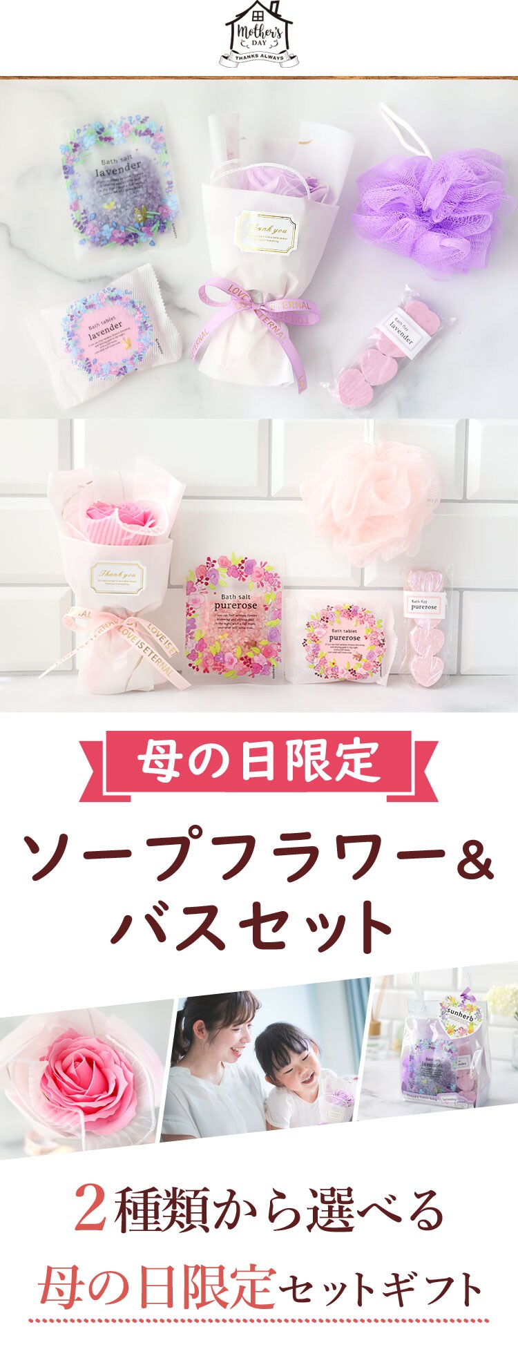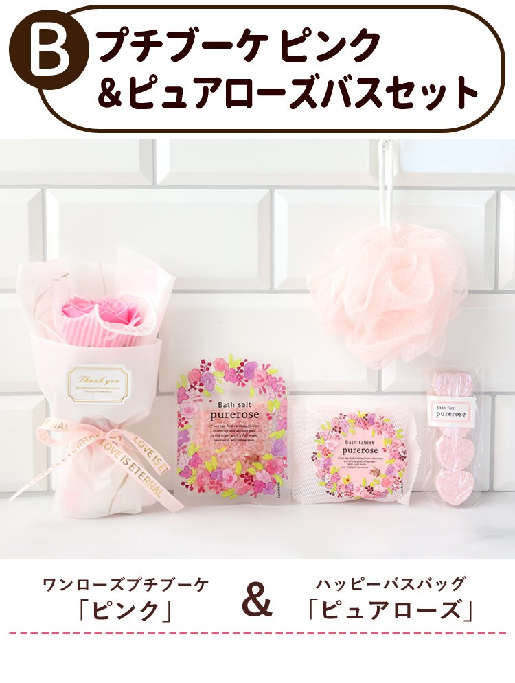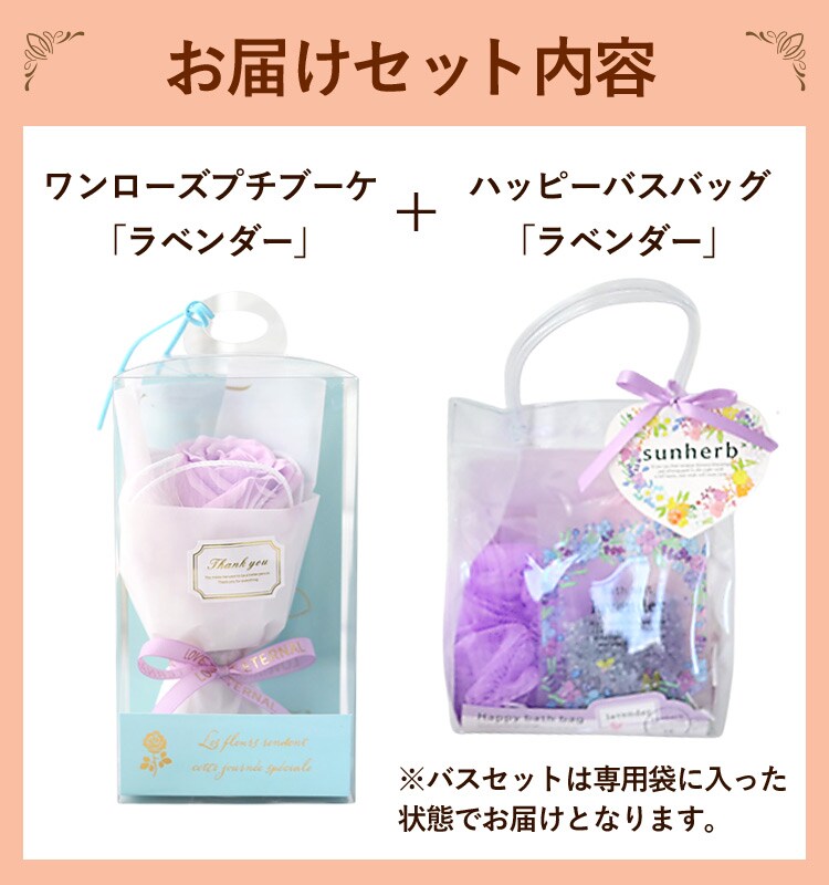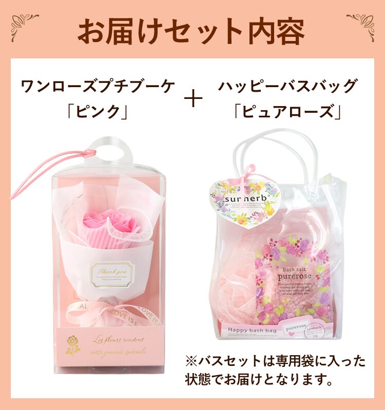 最短発送【 正午までの受付で当日出荷】 遅れてごめんね【母の日ギフト2025】ソープフラワー ワンローズプチブーケ「ピンク」&ハッピーバスバッグ「ピュアローズ」セット ※北海道・沖縄はお届け不可 花由