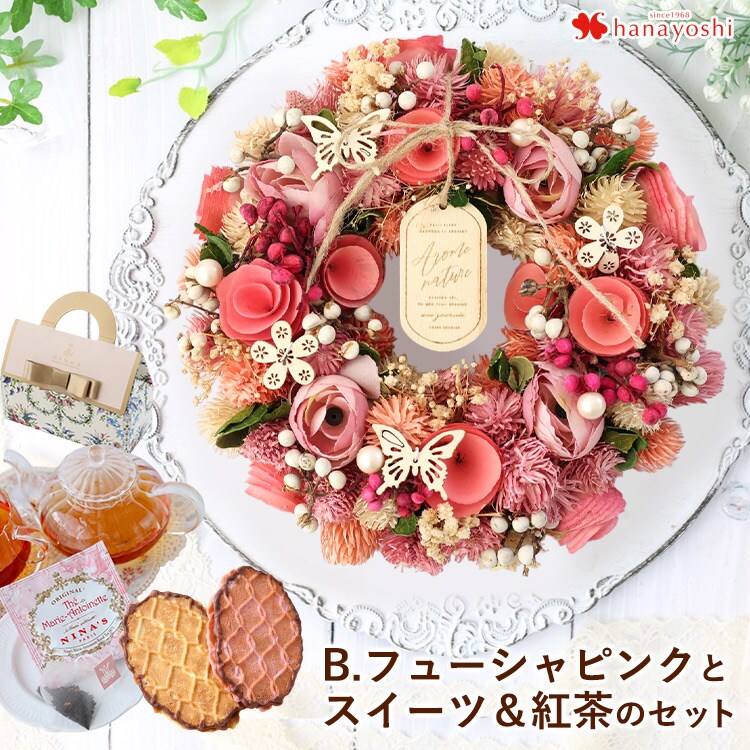 【母の日ギフト2025】ドライフラワー リース「フューシャピンク」& ワッフルクッキー&紅茶セット【5月6~11日の間でお届け※当店おまかせ】※北海道・沖縄はお届け不可 花由