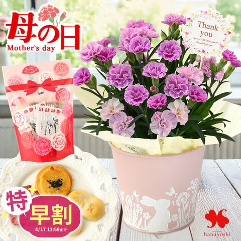 \特早割!/母の日 2026 組合せ40通り 花とスイーツのセット カーネーション「源氏」 & 洋風焼き菓子セット 花 ギフト プレゼント 鉢植え