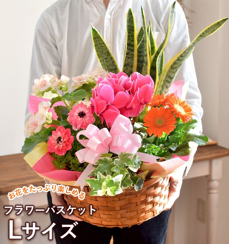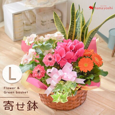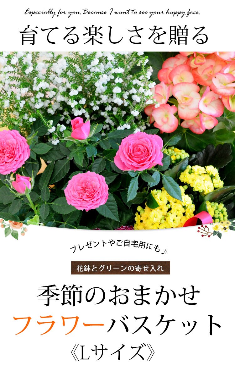 季節のおまかせ花鉢とグリーンの寄せ入れ Lサイズ フラワーバスケット ※北海道・沖縄はお届け不可 花由