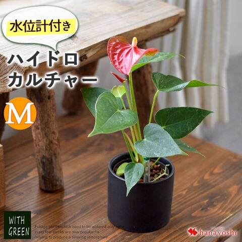 観葉植物 ハイドロカルチャー 水位計付きモノトーンポット Mサイズ「アンスリウム」【手提げ袋付】※北海道・沖縄はお届け不可 花由