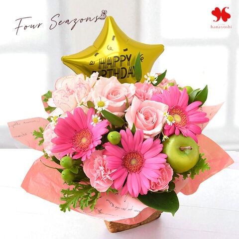季節のおまかせ生花アレンジメント バルーン Birhday「ピンク系」【手提げ袋付】※北海道・沖縄はお届け不可 花由