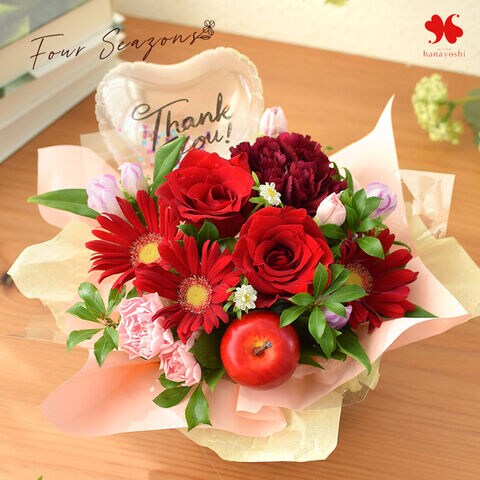 季節のおまかせ生花アレンジメント バルーン Thankyou「レッド系」【手提げ袋付】※北海道・沖縄はお届け不可 花由