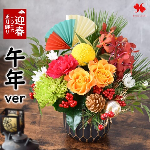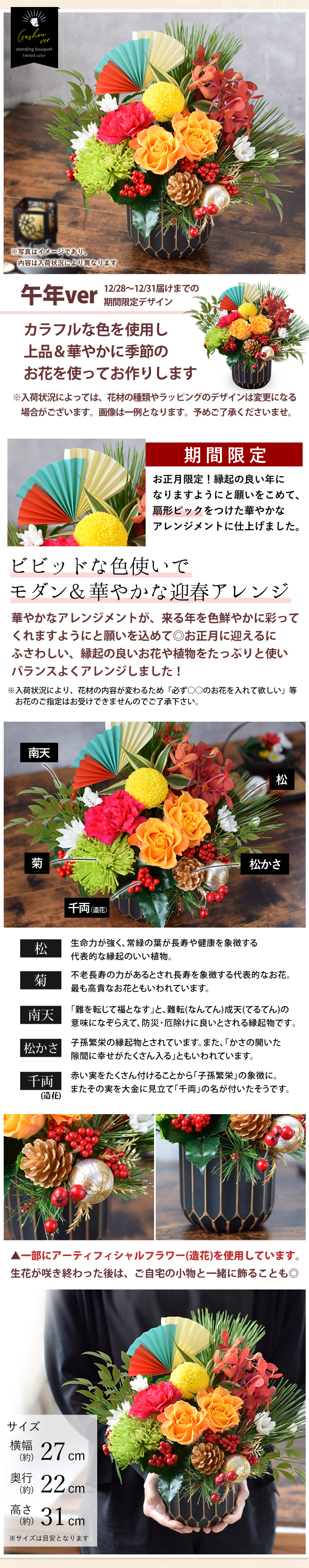 [12月28日~12月31日]の間でお届け※当店におまかせ 季節のおまかせ生花アレンジメント Lサイズ「午年ver」【年の瀬定型文カード付】※北海道・沖縄はお届け不可 花由