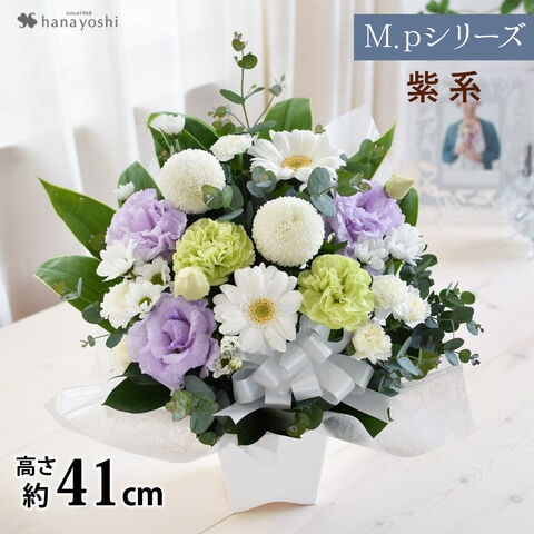 お供え生花アレンジメント M.pサイズ「白+紫系」※北海道・沖縄はお届け不可 花由