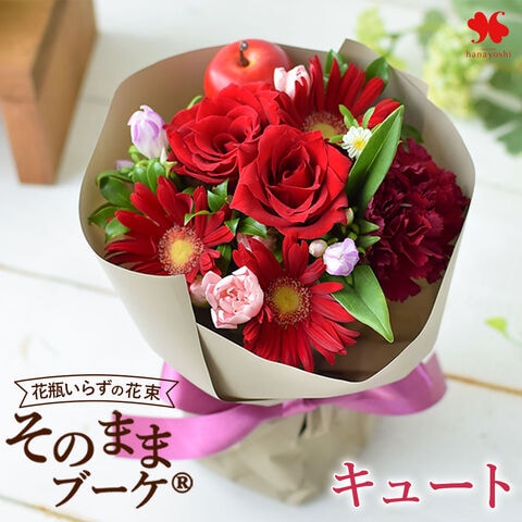花瓶の要らない花束 そのままブーケ キュート「レッド系」【手提げ袋付】※北海道・沖縄はお届け不可 花由