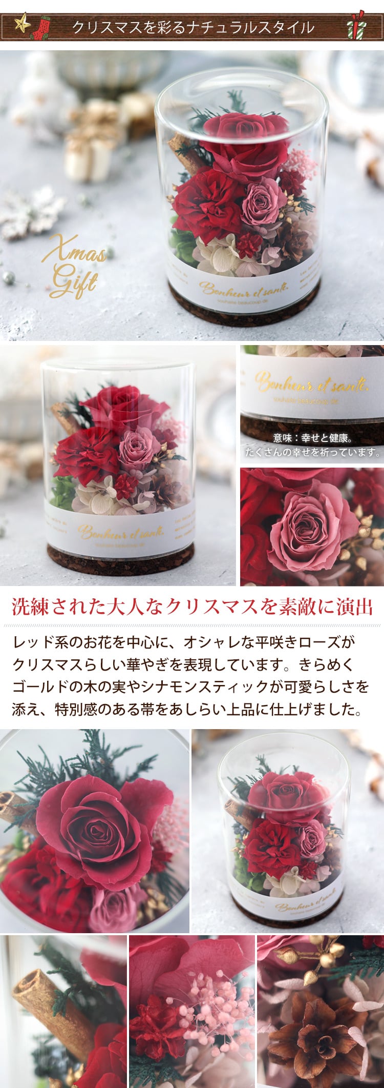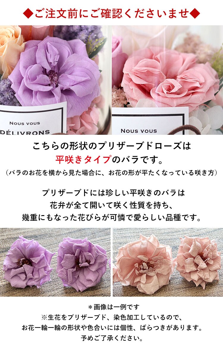 | 内容 | プリザーブドグリーン/プリザーブドローズ/ドライフラワー/シナモンスティック/木の実など/ガラスボトル/タグ/ラッピング/リボン(デザインは当店におまかせください)/ /ご希望の方にはメッセージカード/手提げ袋/取扱説明書/品質保証付リーフレット ※ご注文前にご確認くださいませ ・プリザーブドフラワー・ドライフラワーは生花を加工しているため、製造ロットや個体ごとに、サイズ・色合い・質感などが若干異なります。 ・花材と花材、花材と資材の接触面に多少の色移りがある場合がございます。 ・自然素材を手作りで製作しており、配置等が若干異なる場合がございます。 ・自然素材のため、輸送中の振動等により、葉や実、パーツなどが若干落ちる場合がございますが、 こちらの事由による返品・交換はお受けすることができません。予めご了承をお願いいたします。 ※ご覧いただいているデバイスの画面によって、実際の商品と色合いや明るさなどのイメージが異なる場合がございます。 ※入荷状況により、器のデザイン、花の色味・資材の一部が変更になる場合がございます。 |
