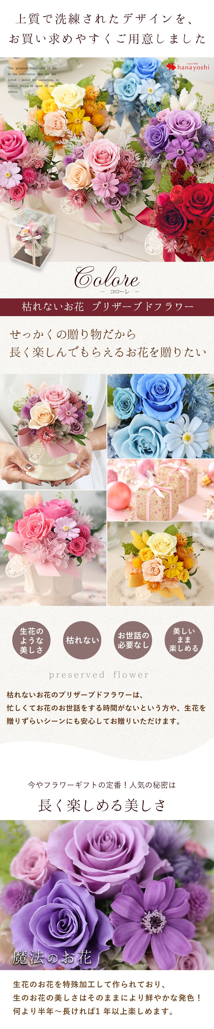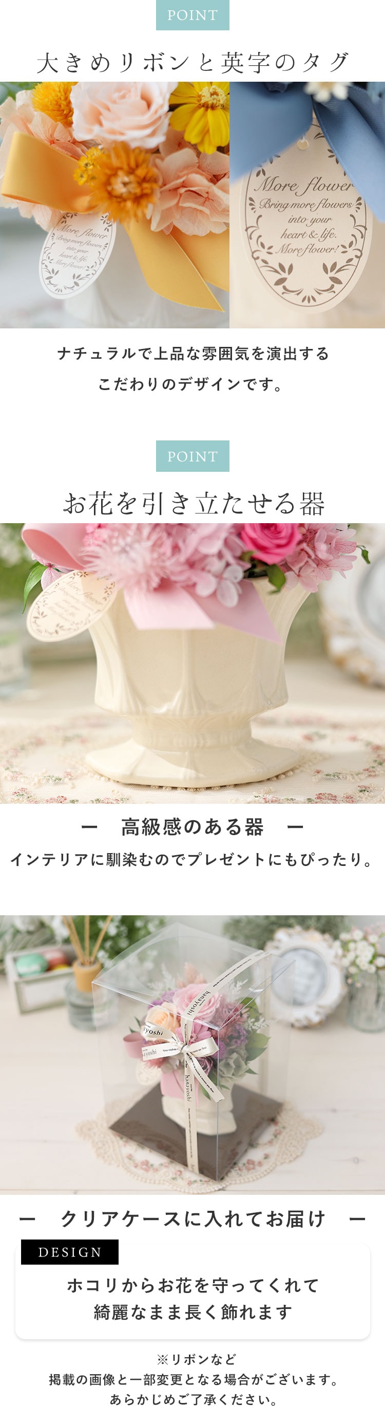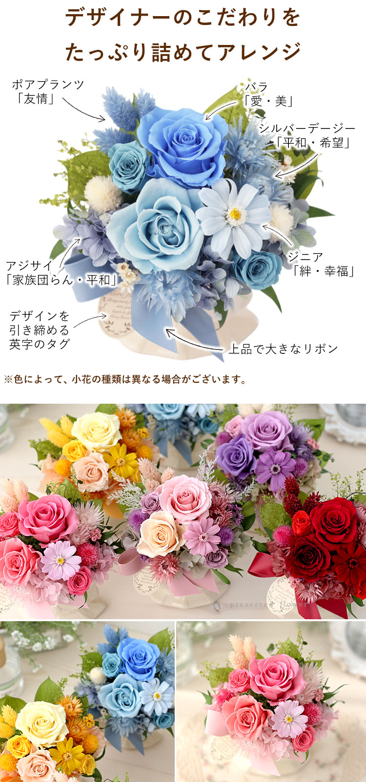※プリザーブドフラワー・ドライフラワーは生花を加工しているため、製造ロットや個体ごとに、