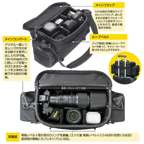 ●メインコンパート:デジタル一眼レフをレンズを装着したまま収納でき、素早い出し入れが可能。大口径レンズを装着したまま立体的に収納できる独自の構造。70-200mmF2.8クラスのレンズにテレコンバーターを装着した一眼レフでも、効率よく収納可能。