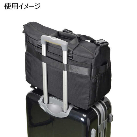 バッグ背面に装備したループベルトを使って、キャリーカートに取り付けることができます。