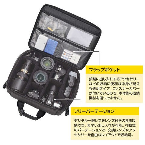 大きく開くメイン収納には、レンズや細かいアクセサリーが効率的に入ります。