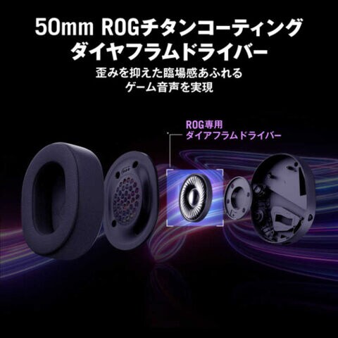 ●50mm ROGチタンコーティングダイヤフラムドライバー: ROG専用ドライバーは、広帯域20Hz20kHzの周波数応答で高品質で鮮明なサウンドを保証