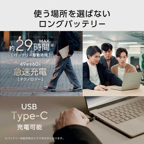 バッテリ駆動時間:バッテリー駆動時間 :約29時間※無線LAN機能/Bluetooth機能/キーボードイルミネート機能/USB接続機能/Windows Update機能を無効にし、MyASUSアプリでのファンモードをスタンダードモード、ディスプレイ輝度を150cd/m2、Windowsの電源モードをトップクラスの電力効率に設定してフルHDの動画を連続再生し測定した結果です (2025年1月ASUS調べ)。使用状況や設定などにより変動します。