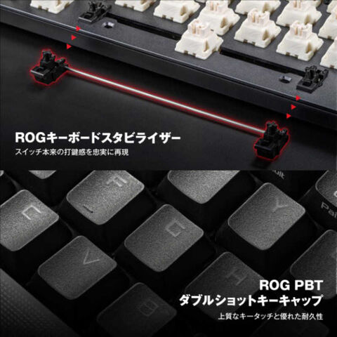 ●PBT / UVコーティングABSキーキャップ: 耐久性に優れたROG PBTダブルショットキーキャップまたはUVコーティングABSキーキャップは、高級感と光沢耐性を提供します*