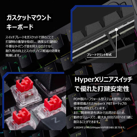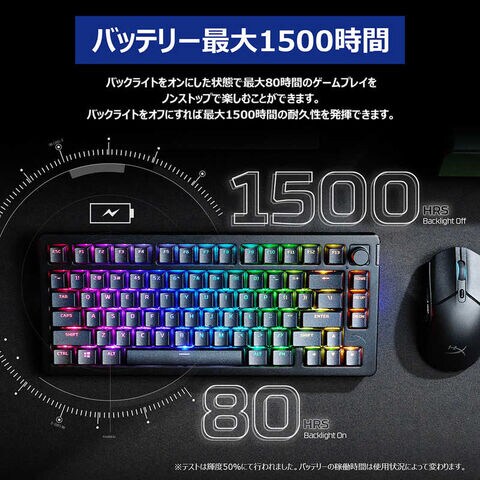 ・最大1500時間駆動のバッテリー・トライモード接続対応・最もカスタマイズ性に優れるツールレス メカニカル ゲーミング キーボード・ホットスワップ対応、HyperXタクタイルスイッチ(別売)にも交換可能・部屋の明るさに合わせてRGBライティングの輝度が変化するダイナミックアンビエントライトセンサー・打鍵時の衝撃を吸収するガスケットマウントキーボード・最大8000万クリックの優れた耐久性・独立したメディアコントロールキー形状:75%カラー:ブラックスイッチ:HyperXリニアタイプ:メカニカルバックライト:RGB(ソフトウェアでカスタマイズ可能な1677万色)ライト効果:5段階で輝度調整が可能なPer key RGBライティングインターフェース:2.4GHz wireless, USB-C to USB-A, BluetoothUSBパススルー:非対応ポーリングレート:1000Hzアンチゴースト:全てロールオーバー:全てメディアコントロール:独立型メディアコントロールキーゲームモード:対応防水機能:非対応ケーブル:取り外し可能なブレイデッドケーブルバッテリー:リチウムイオン電池