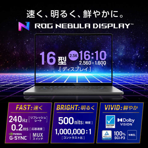 仕様1:[表示機能] ディスプレイ:16.0型 OLED (有機EL) 表面仕様:グレア 解像度:2560×1600ドット (240Hz) 視野角:水平178°/垂直178° 外部ディスプレイ出力:最大7680×4320ドット ※外部ディスプレイの仕様によっては表示できない場合があります。