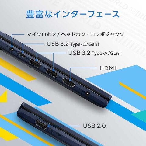 USB 2.0 ×1、USB 3.2 (Type-A) ×2、USB 3.2 (Type-C)×1、HDMI出力、オーディオジャックを備え、周辺機器やディスプレイ、プロジェクターも簡単に接続できます。