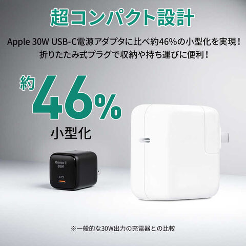 次世代チップ、GaN(窒化ガリウム)により、従来品に比べ約50%のコンパクト化に成功しました。コンパクトなサイズ感に折りたたみ式プラグ搭載で持ち運びや収納にも便利です。