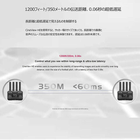 CineView HEは0.06秒未満の低遅延で、最大350mの距離でもスムーズに画像と音声を送信可能です。