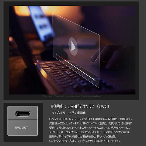 CineView HEの送信機は、1つのHDMI入力と1つのHDMIループアウト(ゼロレイテンシロスレス出力)に対応。また受信機に新機能「UVC Out」を追加。USB-Cケーブルを使用して、受信機が受信した映像をYouTubeなどのライブストリーミング用にコンピューター上のサードパーティのストリーミングプラットフォームに転送できます。