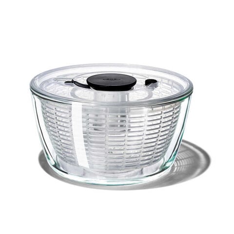 片手でノブを押すだけでカゴが回転して、簡単に野菜の水切りができるサラダスピナーのガラスタイプが新登場。