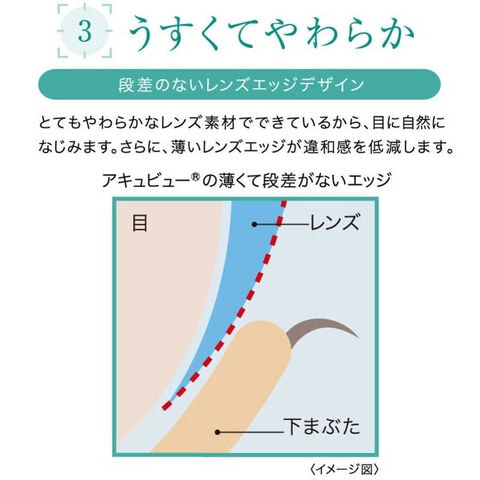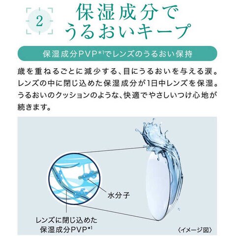 歳を重ねるごとに、目にうるおいを与える涙が減少します。レンズに閉じ込めた「保湿成分」により1日中快適なつけ心地が続きます。