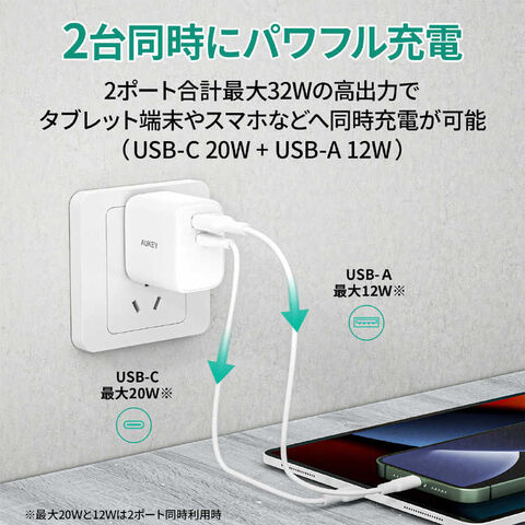 2ポート同時使用時は2台の機器へ合計最大32W(USB-C 20W + USB-A 12W)の高出力で同時充電が可能です。