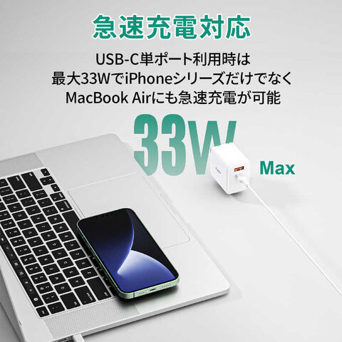 USB-C単ポート使用時はMacBook Air等のノートPCの急速充電も可能な、最大出力33Wを実現しています。