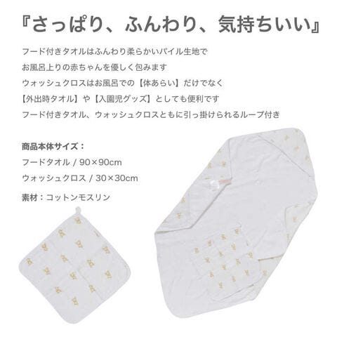 フード付きタオル、ウォッシュクロスともに引っ掛けられるループ付き