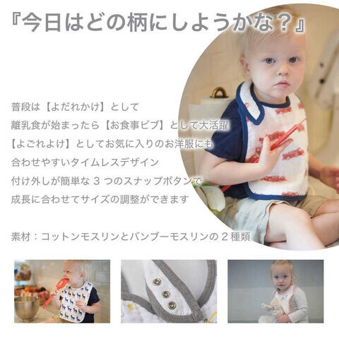 バンブーモスリン素材のビブは普段はよだれかけとして、離乳食が始まったらお食事ビブとして大活躍。よごれよけとしてお気に入りのお洋服にも合わせやすいタイムレスデザイン。
