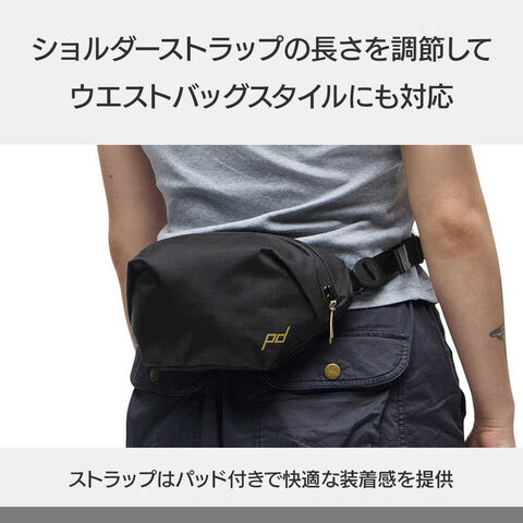 パッド付きショルダーストラップはCord Hook(TM)(コードフック)で取り外しができ、右肩がけ、左肩がけを簡単に変えられます。また、ショルダーストラップの長さを調節して、ウエストバッグスタイルへ切り替えもできます。