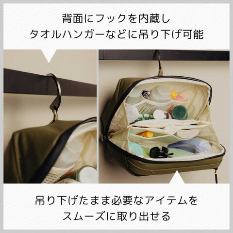 ポーチ背面には、タオルハンガーなどに吊り下げるための丈夫なアルミニウム製フックを内蔵しています。
