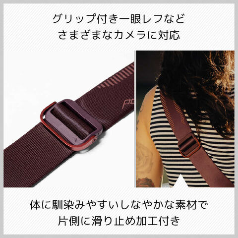 グリップ付一眼レフなど、多くのサイズのカメラに対応したストラップです。