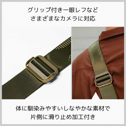 グリップ付一眼レフなど、多くのサイズのカメラに対応したストラップです。