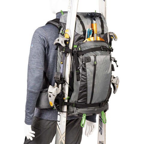 バックカントリーでの撮影の際に必要なスキー板やスノーボード、ロープ、アックスなど、またカメラ以外に必要な装備を収納できるカメラバックパックです。