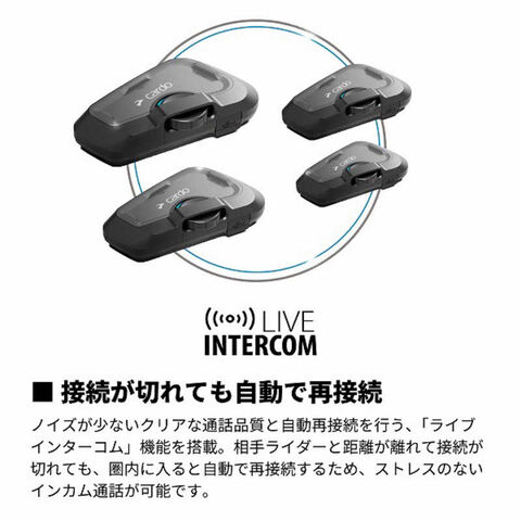 ノイズが少ないクリアな通話品質と自動再接続を行う、「ライブインターコム」機能を搭載。