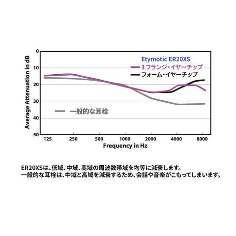 会話や音楽を明瞭に再現 従来のEarplugs(耳栓)は中域と高域を減衰するため、会話や音楽がこもってしまいます。