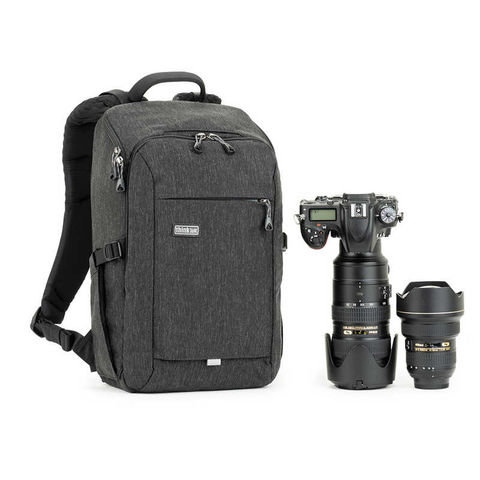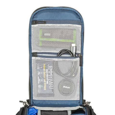 バックパネルは大きく全体が開くためメインコンパートメントを確認でき、バッグ上部からもスピーディーに内部にアクセスできます。取り外し可能なウエストベルトを装着すれば、容量いっぱいに収納しても快適な持ち運びを叶えます。また、バックパネル裏側とトップフラップ内側にはそれぞれメッシュポケットがあり、フィルターやバッテリーなどアクセサリー類を収納可能。前面ポケットにはノートPCやタブレット収納部のほか、オーガナイザーポケット、メッシュポケットを備えています。バッグ背面にはパススルーが付いています。