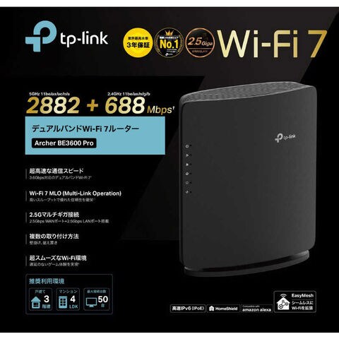 TPLINK Wi-Fi 7 無線LANルーター 2882+688Mbps BE3600 2.5ギガWAN&LANポート [Wi-Fi 7(be) / IPv6対応] ARCHERBE3600PRO