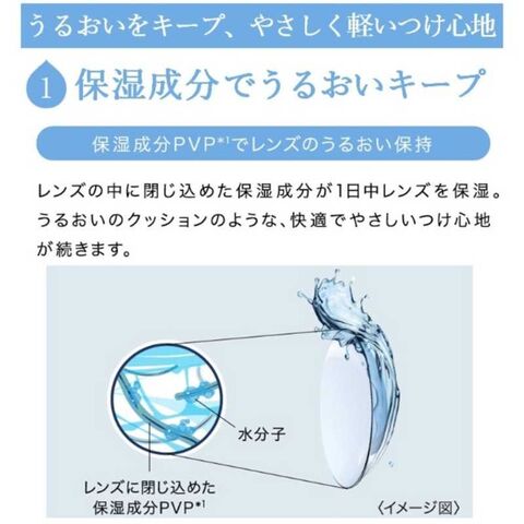 レンズの中に閉じ込めた「保湿成分」が、1日中レンズから逃げ出さないから、やさしいつけ心地が続きます。