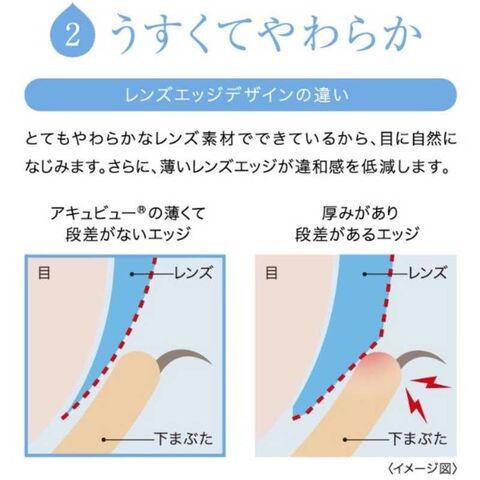 とてもやわらかなレンズ素材でできているから、目に自然になじみます。さらに、薄いレンズエッジが、違和感を低減します。