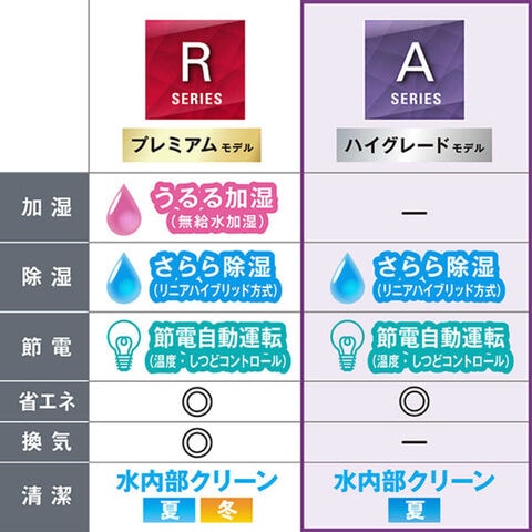 夏場は大容量の除湿、また比較的気温が低い梅雨時期や春や秋の湿気には室温の低下を抑えながら除湿します。