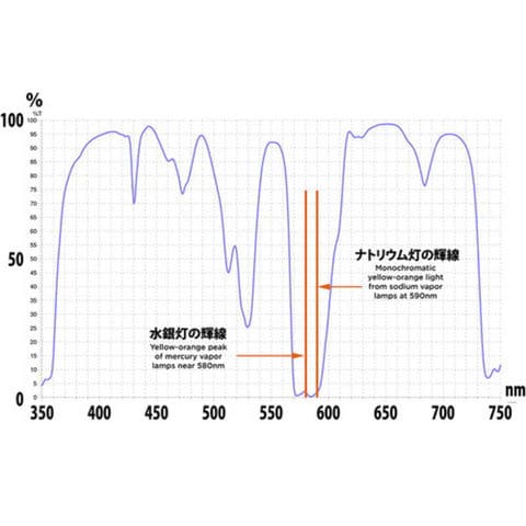 光害カットフィルターは、ナトリウム灯および水銀灯などのような街明かりの特定の波長をカットします。都市夜景撮影では街路灯の黄色とオレンジ色の光を取り除き、天体写真では空のグラデーションを暗くしてコントラストを上げ、星や天の川を強調します。