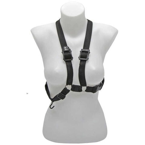 腕や指に過度な負担をかけずに楽器を支えられる、ハーネス・タイプのストラップ。