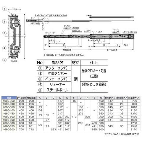 幅×高さ×長さ×移動距離(mm):12.5×45.5×300×296、定格荷重(N)ペア/垂直:200、質量(kg):0.89