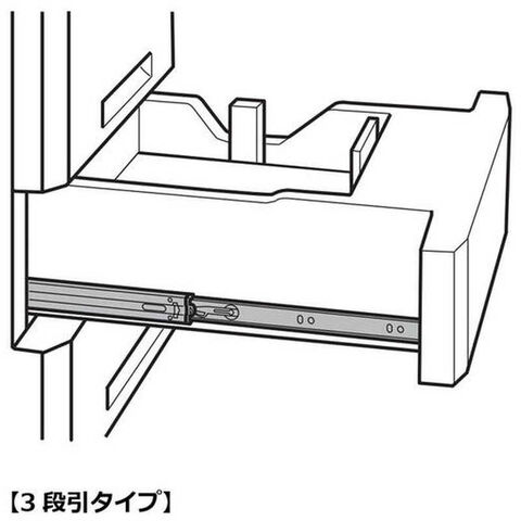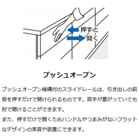 ●プッシュオープン装置付スライドレールです。そのためハンドルやつまみが不要でフラットなデザインのキャビネットに仕上がります。