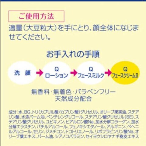 水、BG、トリ(カプリル酸/カプリン酸)グリセリル、オリーブ油、ステアリン酸、水添パーム油、ペンチレングリコール、ステアリン酸グリセリル(SE)、ステアリン酸グリセリル、ユビキノン、ヒアルロン酸Na、加水分解コラーゲン、加水分解エラスチン、バチルアルコール、フェノキシエタノール、アルギニン、ベヘニルアルコール、セリン、ジメチコン、トコトリエノール、リボフラビンリン酸Na、オリーブ葉エキス、パーム油、シアノコバラミン、セイヨウシロヤナギ樹皮エキス