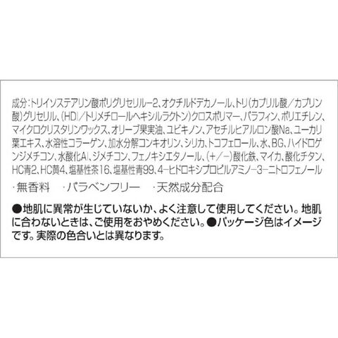 トリイソステアリン酸ポリグリセリル-2、オクチルドデカノール、トリ(カプリル酸/カプリン酸)グリセリル、(HDI/トリメチロールヘキシルラクトン)クロスポリマー、パラフィン、ポリエチレン、マイクロクリスタリンワックス、オリーブ果実油、ユビキノン、アセチルヒアルロン酸Na、ユーカリ葉エキス、水溶性コラーゲン、加水分解コンキオリン、シリカ、トコフェロール、水、BG、ハイドロゲンジメチコン、水酸化Al、ジメチコン、フェノキシエタノール、(+/-)酸化鉄、マイカ、酸化チタン、HC青2、HC黄4、塩基性茶16、塩基性青99、4-ヒドロキシプロピルアミノ-3-ニトロフェノール