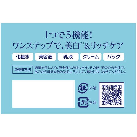 ●化粧水、美容液、乳液、クリーム、パックの5機能をひとつに凝縮したオールインワンタイプ。ワンステップで、リッチなスキンケアが完了します。